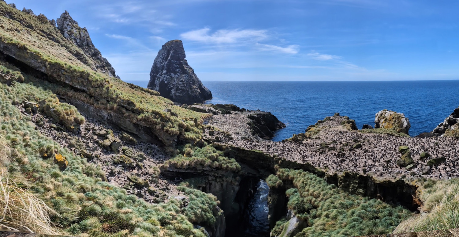 Over the first couple of weeks, the team settled into a routine of frequent chick counts in the colonies closest to the hut, while also beginning drone surveys at sites across the island. It quickly became clear that Erect-crested penguins had been badly affected by the October storms that ravaged southern New Zealand. Low-lying colonies exposed to western swell often contained only adult pairs and no chicks, suggesting that eggs had been lost when waves washed across the breeding sites. At Reef Point, only around a third of the birds were guarding chicks, and drone surveys of the beach colonies in Mirounga Bay revealed that only a tiny fraction of the penguin population had successfully bred. One unexpected exception came from a colony affected by last year’s major rockfall. Only a handful of pairs that had lost their original nest sites had resettled on top of the rockfall debris – but these birds were raising chicks. In this case, the elevated, newly formed nesting area appears to have protected them from wave wash, turning what had initially been a major disturbance into an advantage during a storm-heavy season.